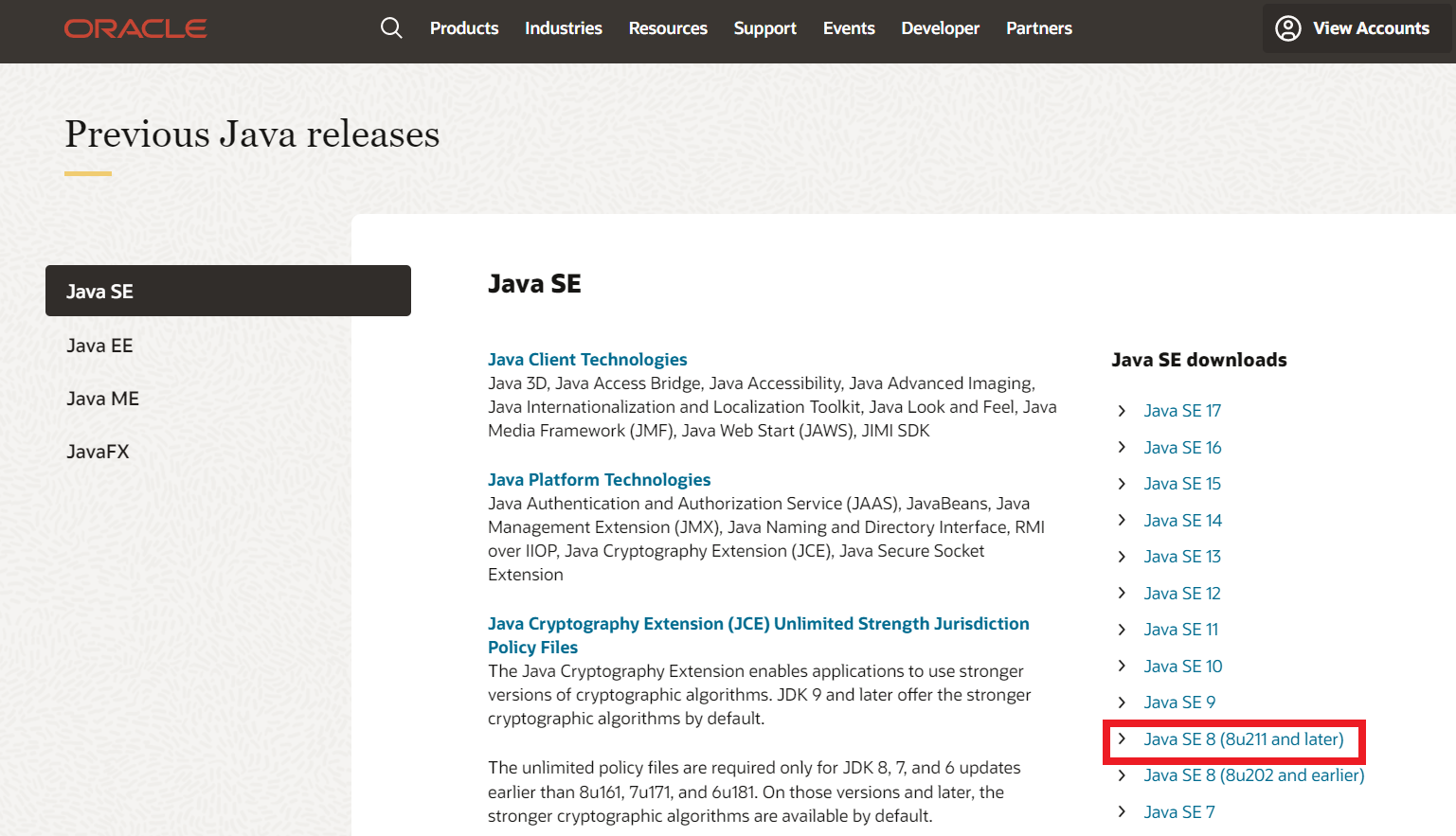 5. 우측에 Java SE 8 (8u211 and later) 클릭