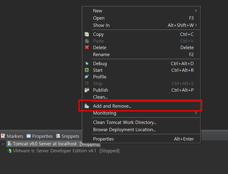 - Available > Configured로 프로젝트 이동 (기존에 등록한 이력이 있으면 servers 톰캣 우클릭 Add and Remove...)